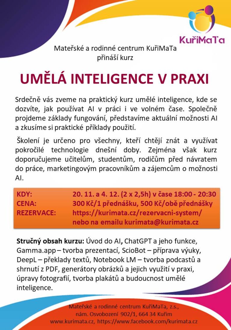 Stručný obsah kurzu: Úvod do AI, ChatGPT a jeho funkce, Gamma.app – tvorba prezentací, ScioBot – příprava výuky, DeepL – překlady textů, Notebook LM – tvorba podcastů a shrnutí z PDF, generátory obrázků a jejich využití v praxi, úpravy fotografií, tvorba plakátů a budoucnost umělé inteligence.